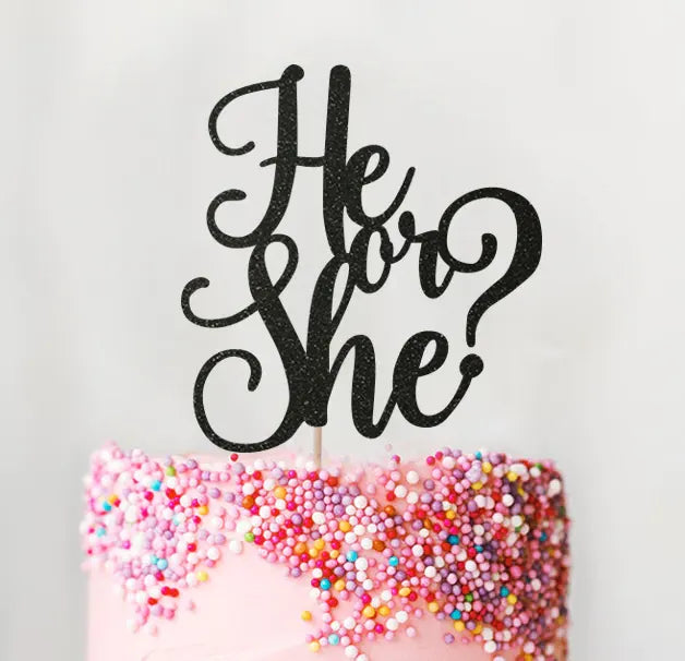 Pink gender reveal cake with a black glittery He or She topper and colorful sprinkles on the side.