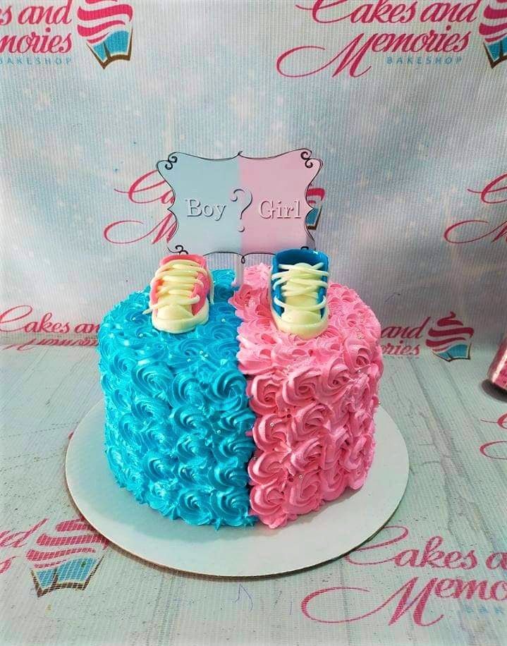 Gender reveal cake with half blue and half pink icing rosettes, topped with baby shoes and a Boy or Girl sign.