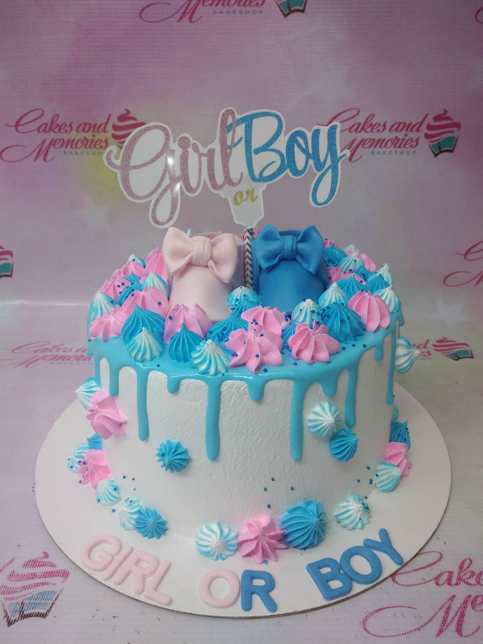 Gender reveal cake with blue and pink icing swirls, blue drip, and a Girl or Boy topper with fondant baby shoes.