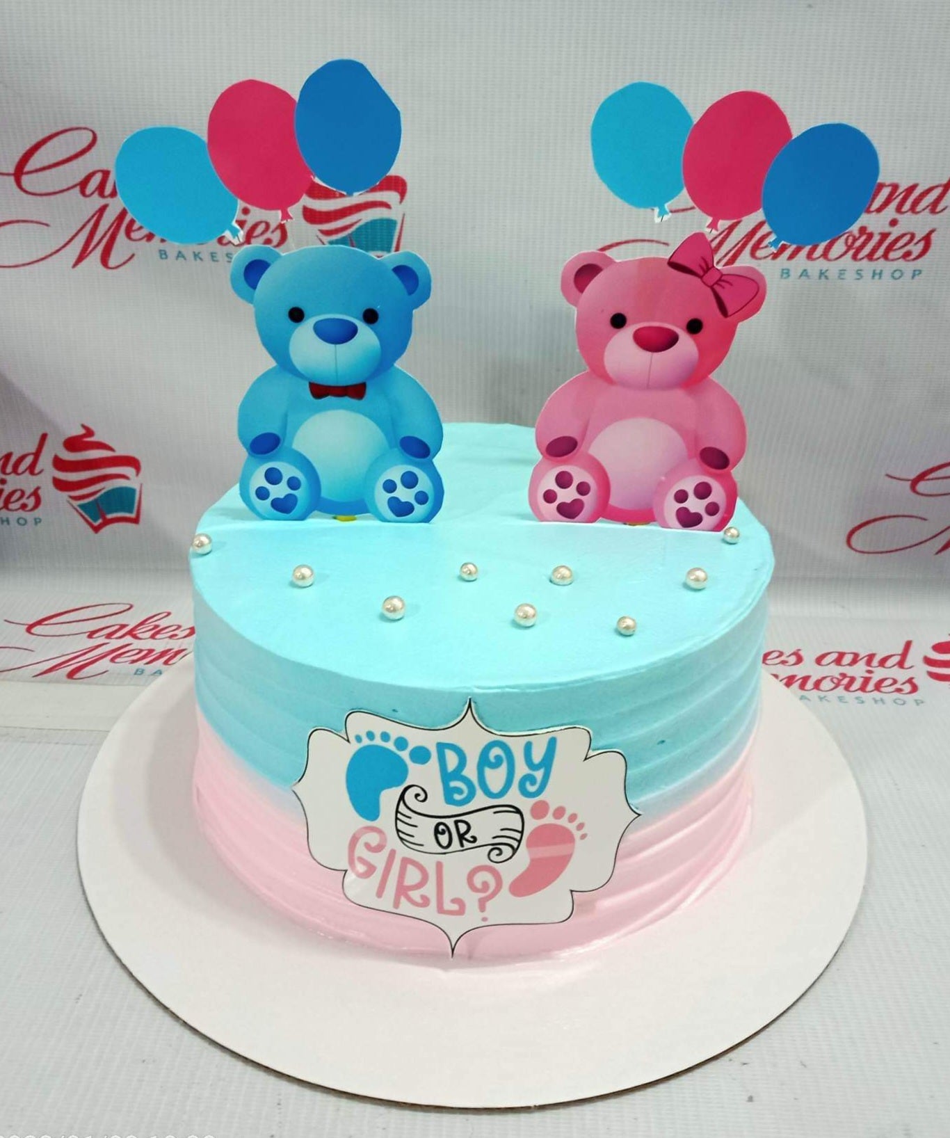 Gender reveal cake with blue and pink icing, featuring blue and pink bear toppers and a Boy or Girl message.