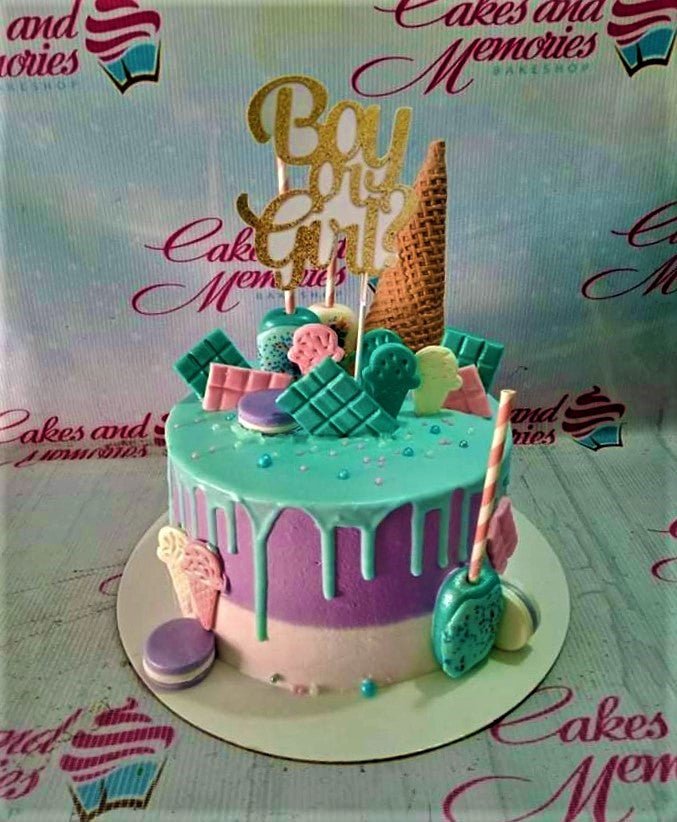 A gender reveal cake with purple and pink icing, a teal drip, and various ice cream and chocolate bar toppers.