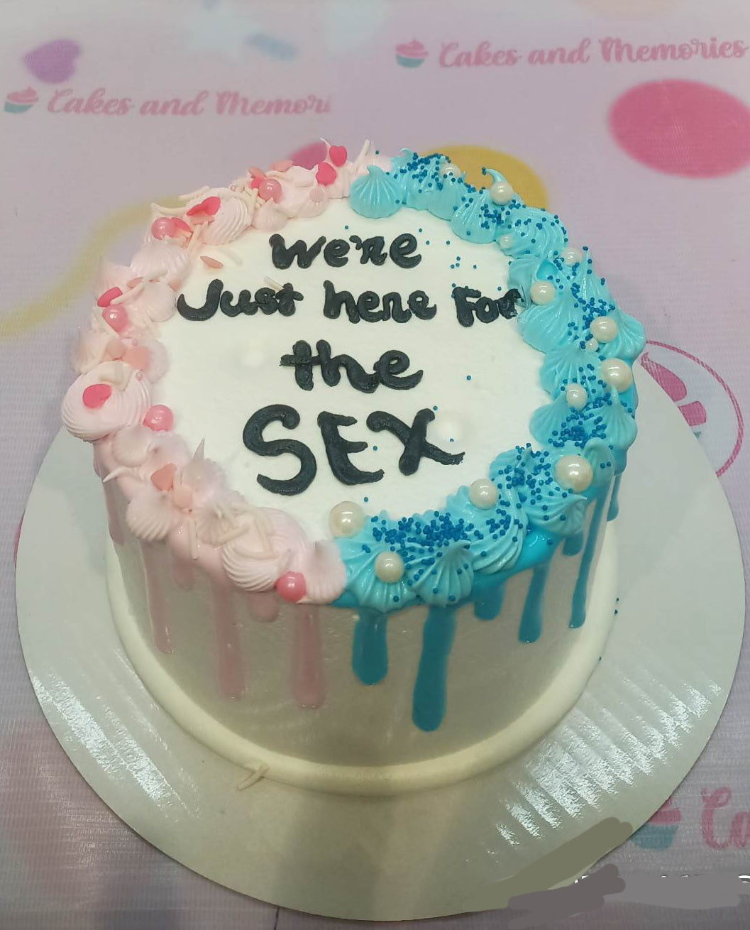 Gender reveal cake with pink and blue icing drips, rosettes, and a humorous message in black icing.