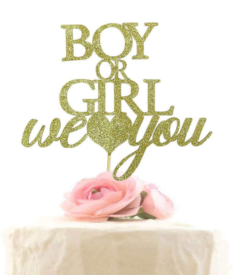 White soft-icing cake with a large gold glitter 'Boy or Girl we love you' cardstock topper and pink artificial roses.