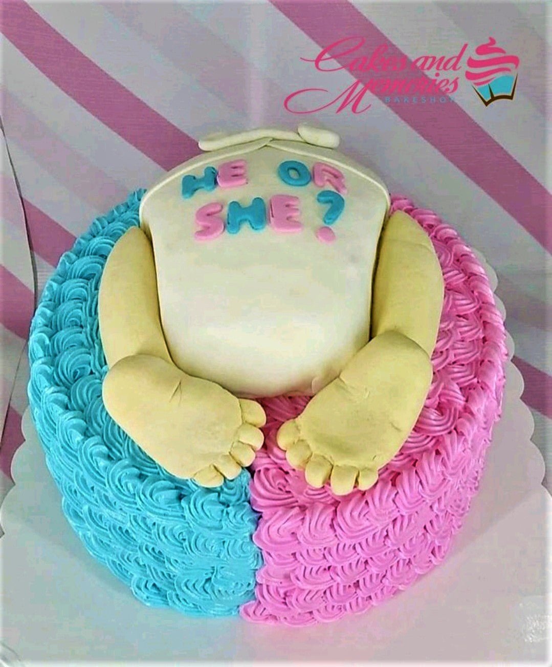Gender reveal cake with pink and blue icing rosettes and a 3D fondant baby bottom topper with 'He or She?' message.