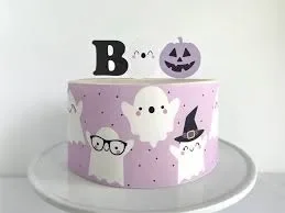 Lavender Halloween cake featuring a ghost-themed side wrap and toppers including a black 'B', a white ghost, and a purple pumpkin.