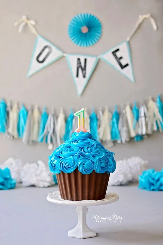 Giant Cupcake First Birthday Cake | Blue Rosette Smash Cake Design