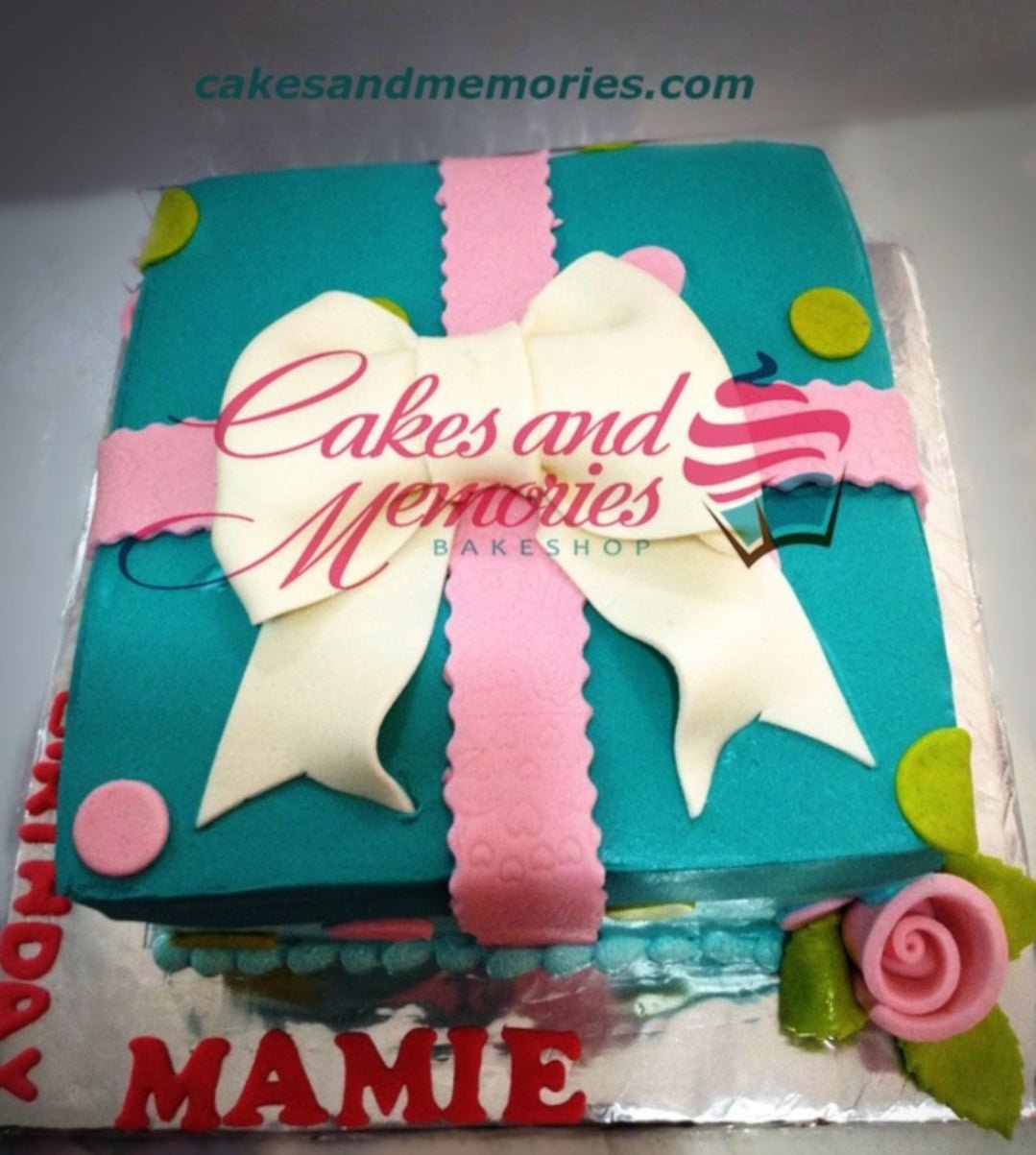 Teal square fondant gift box cake with a large white fondant bow, pink ribbons, and a pink edible rose.
