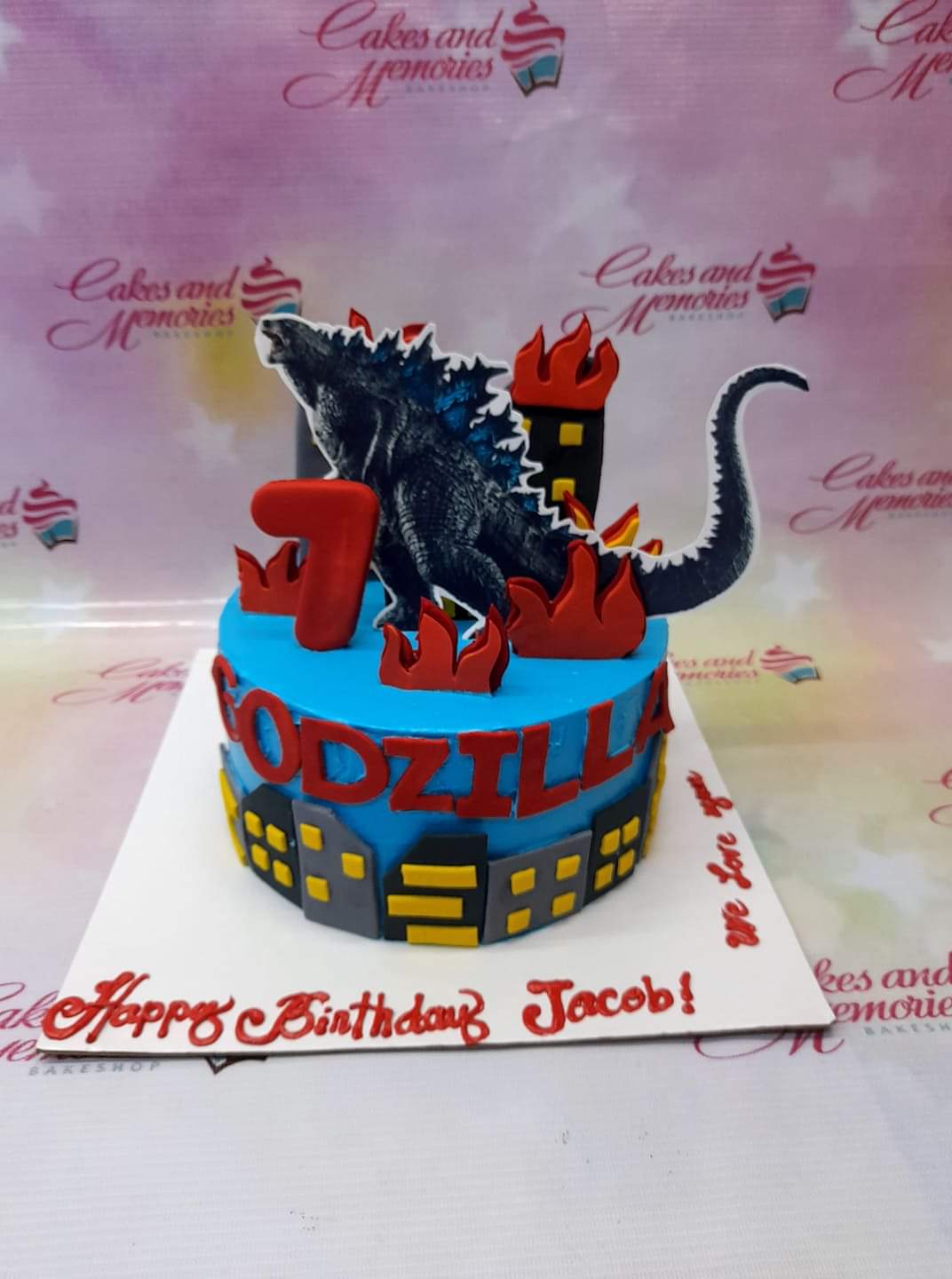 Blue Godzilla themed birthday cake with 3D fondant buildings, red flames, and a large Godzilla character cutout.
