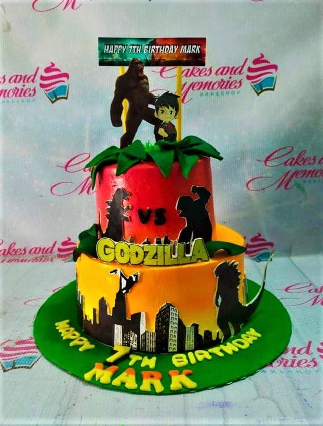 Two-tier Godzilla vs Kong themed birthday cake with orange and red gradient icing, city silhouettes, and character toppers.