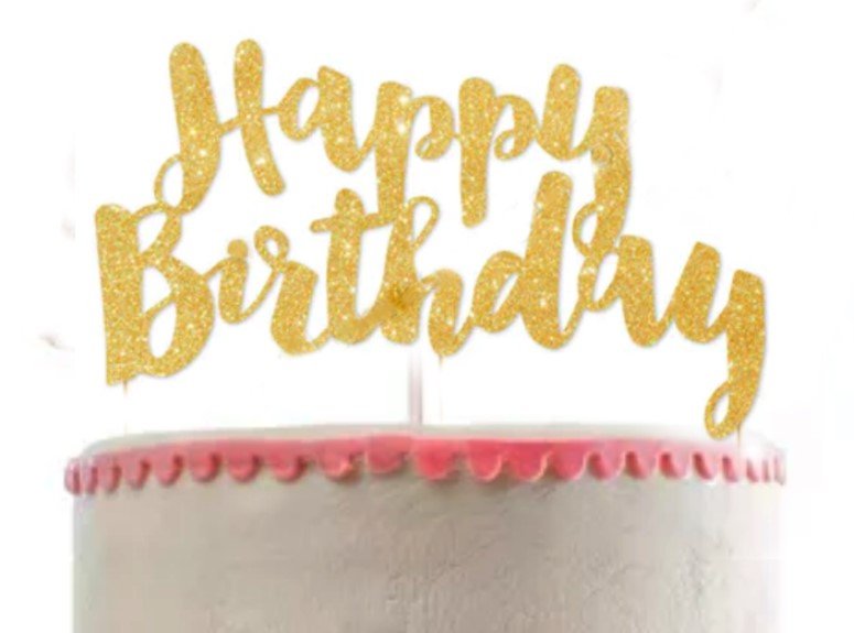 White minimalist birthday cake with a large gold glitter Happy Birthday cardstock topper and pink icing border.