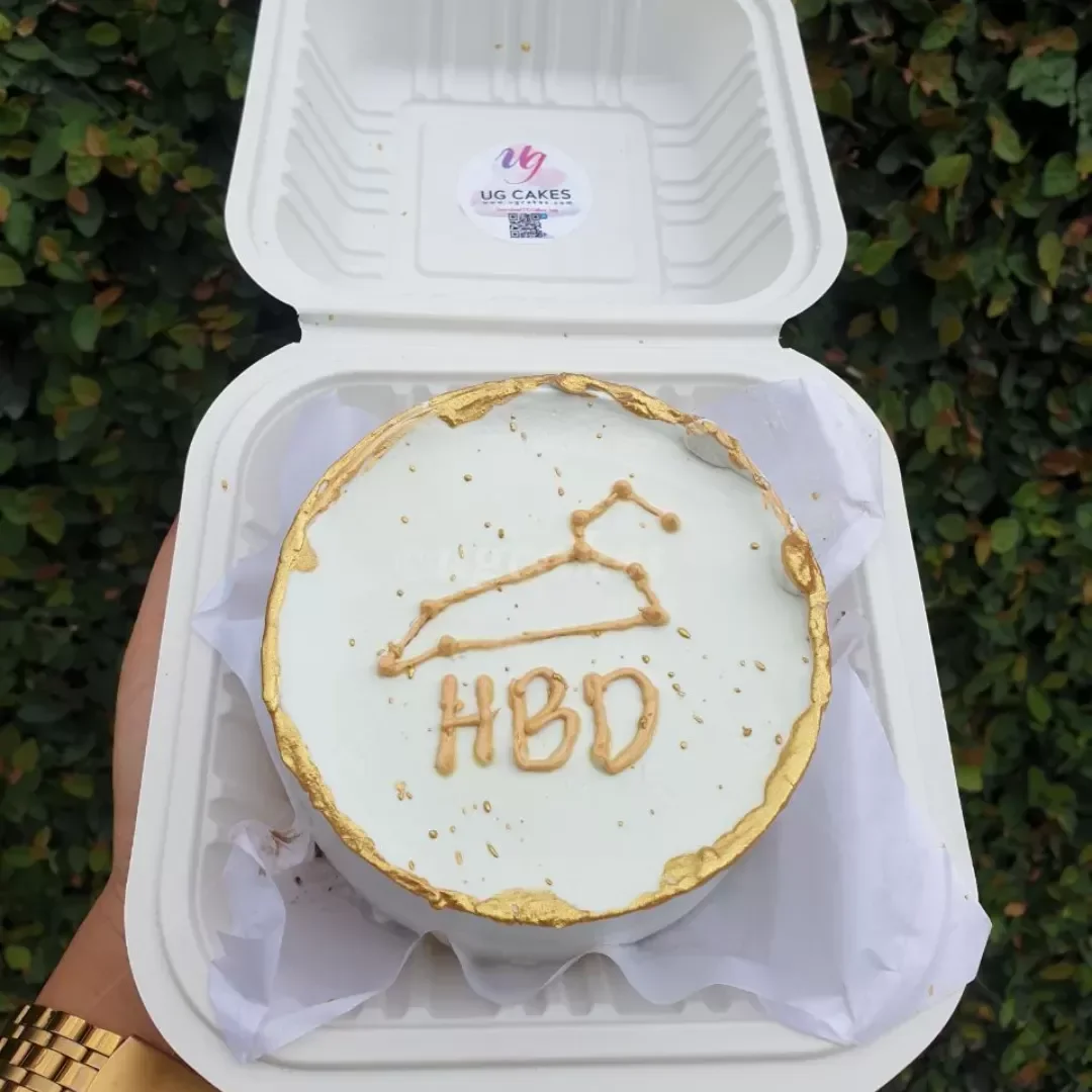 White bento cake with gold painted edges and a gold constellation design with HBD message in a white takeout box.