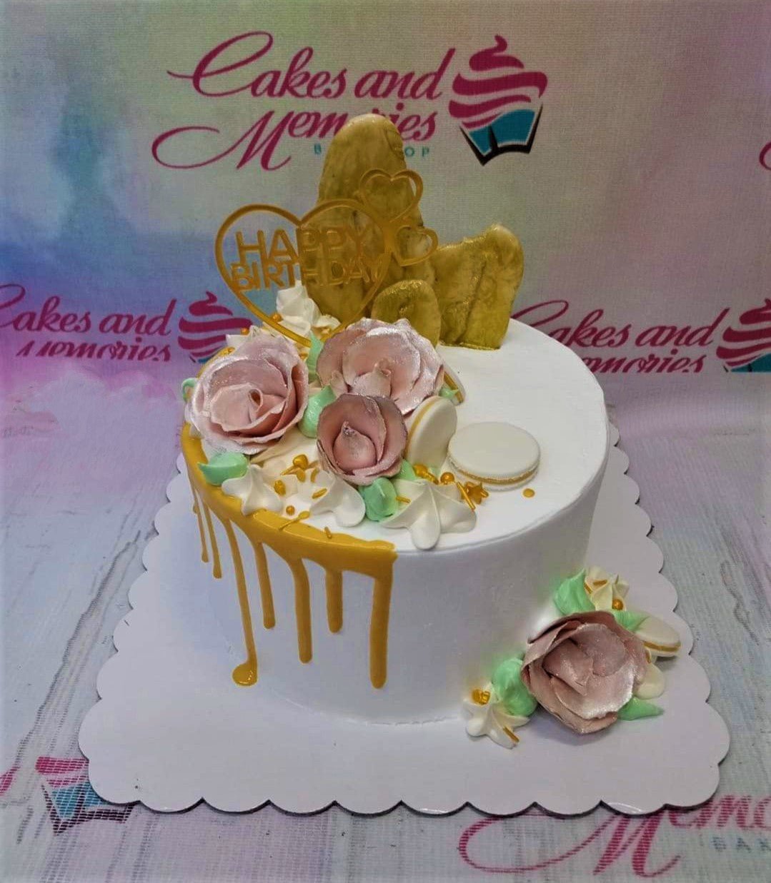 White round cake with gold drip, pink edible roses, and a gold Happy Birthday heart topper.