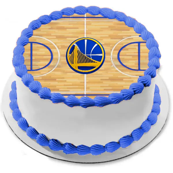 Golden State Warriors basketball court themed cake with blue icing borders and team logo.
