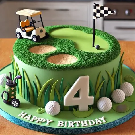 Golf themed birthday cake with a white golf cart, checkered flag, sand traps, and golf balls on a green grass-textured base.