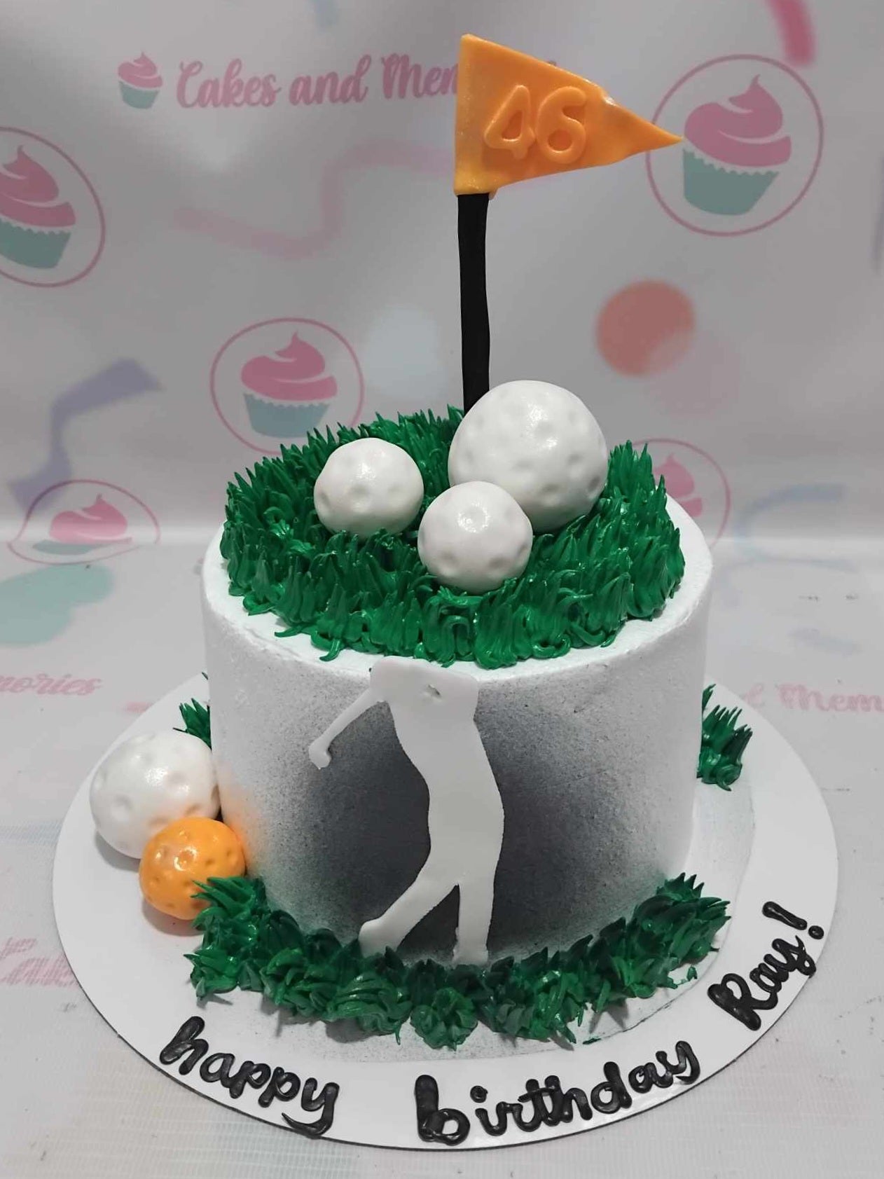 White golf themed birthday cake with green icing grass, fondant golf balls, a flag with number 46, and a golfer silhouette.