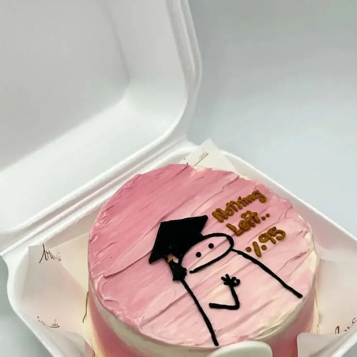 Pink and white bento cake with a hand-drawn flork character wearing a graduation cap and the message Nothing Left.. 1.95