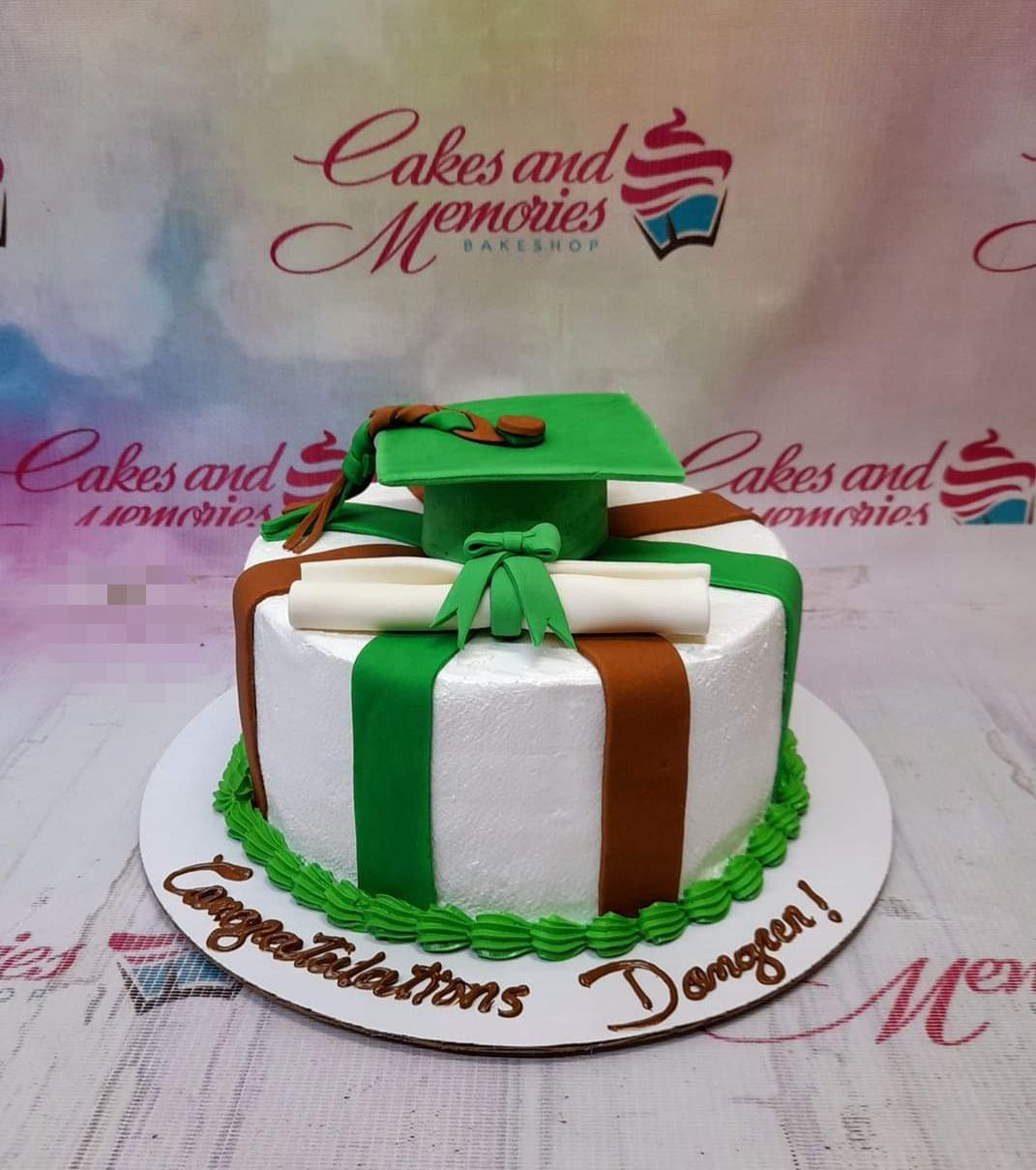 White graduation cake with green and brown fondant ribbons, a graduation cap, and a diploma topper.