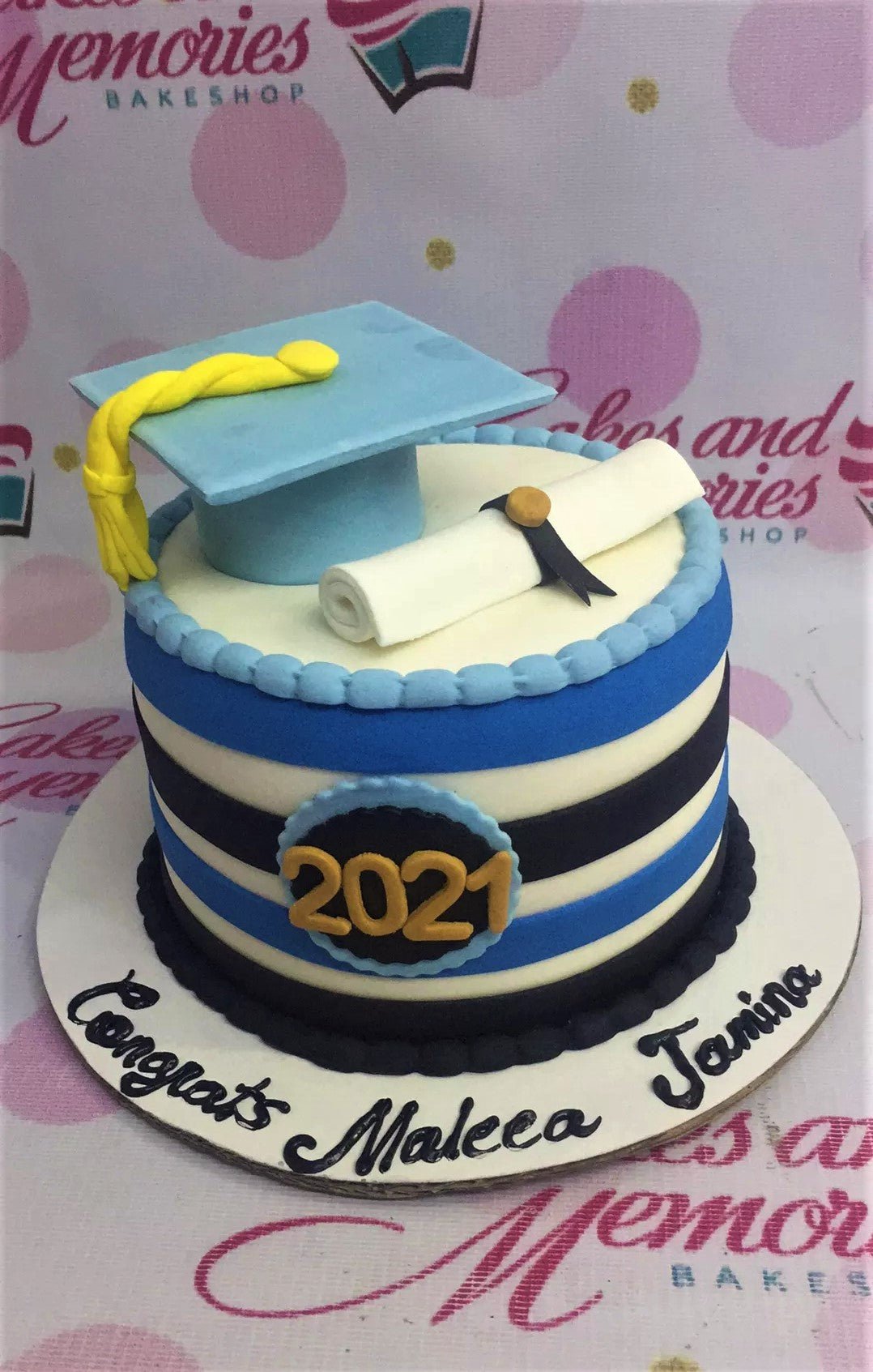 Blue and white striped graduation cake with a fondant graduation cap, diploma, and 2021 year topper.