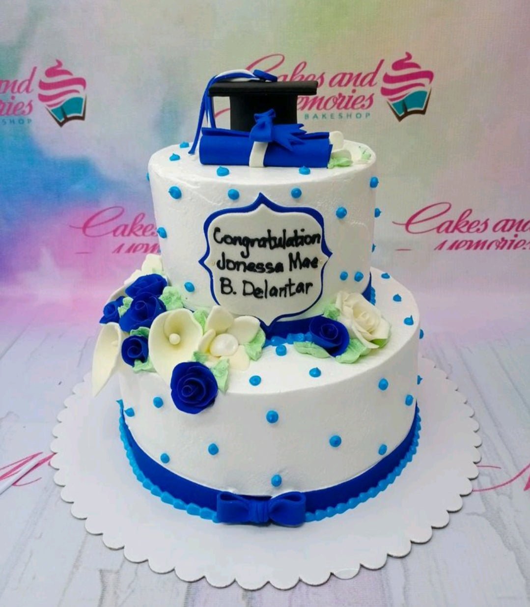 Two-tier white graduation cake with blue accents, a black graduation cap topper, blue fondant roses, and a personalized message plaque.