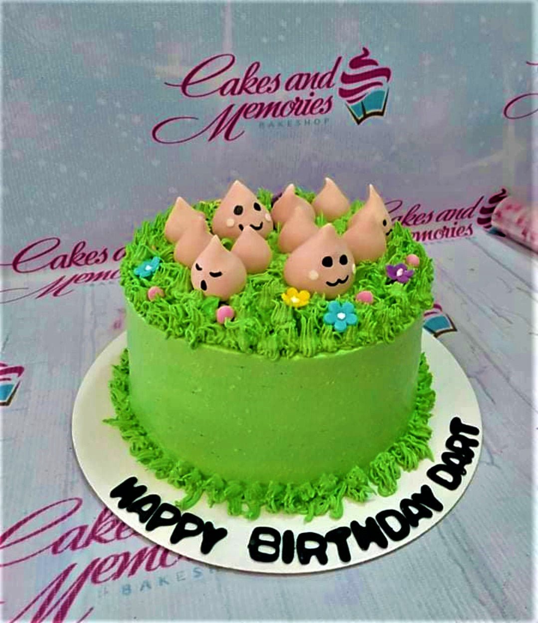 Green grass-themed birthday cake with cute pink blob characters and colorful icing flowers.