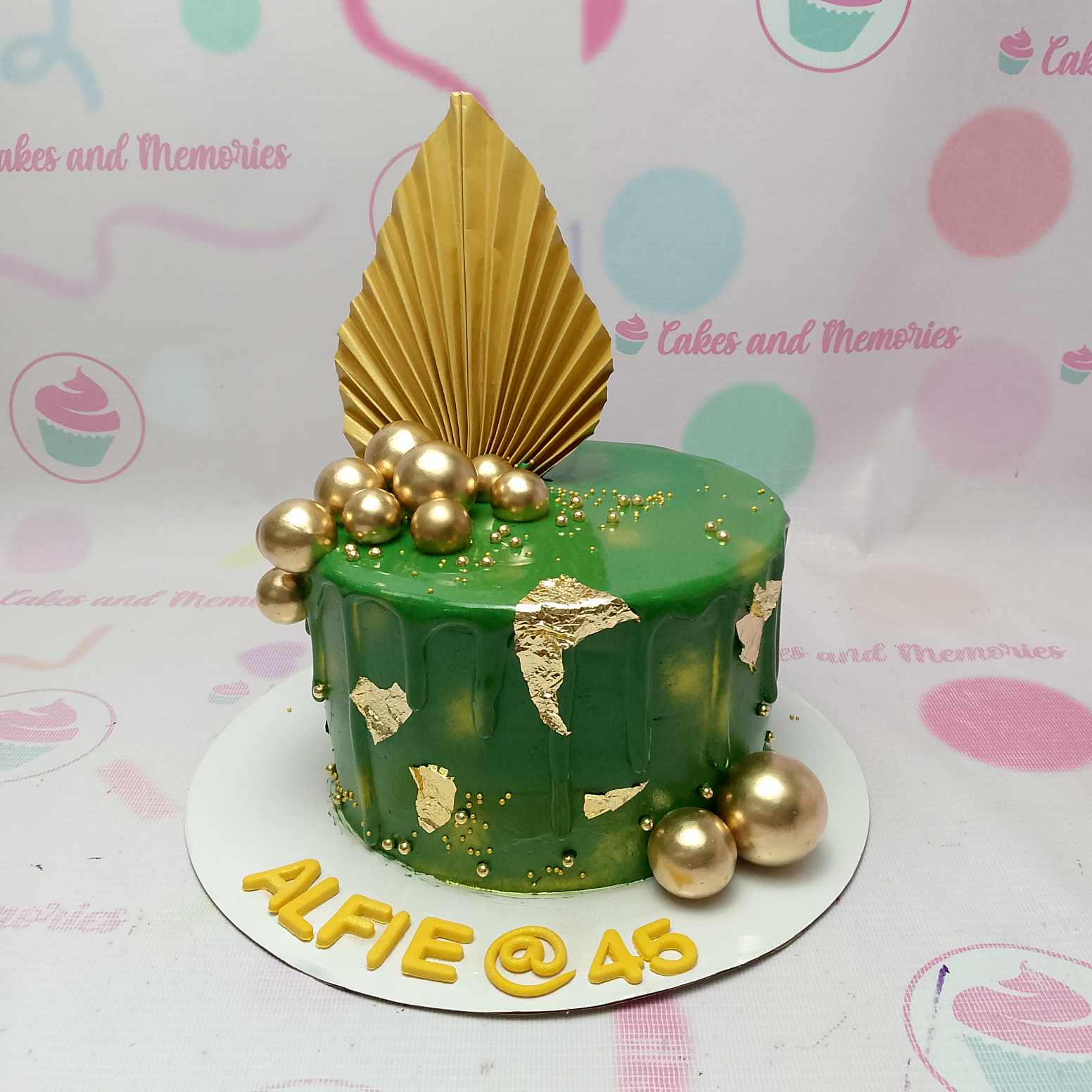 Green 1-tier birthday cake with gold drip, gold leaf accents, gold spheres, and a large gold fan topper.