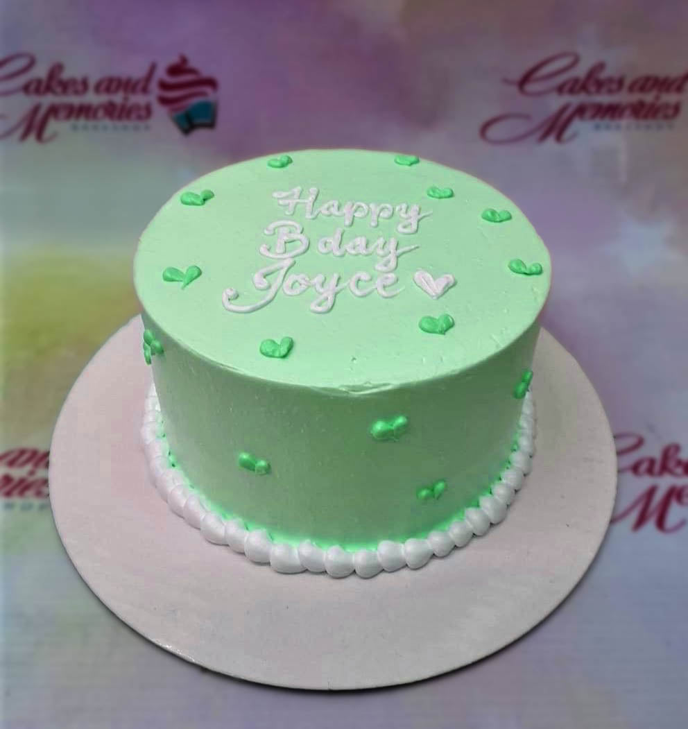 Light green minimalist bento cake with white piped icing message and small green heart decorations.