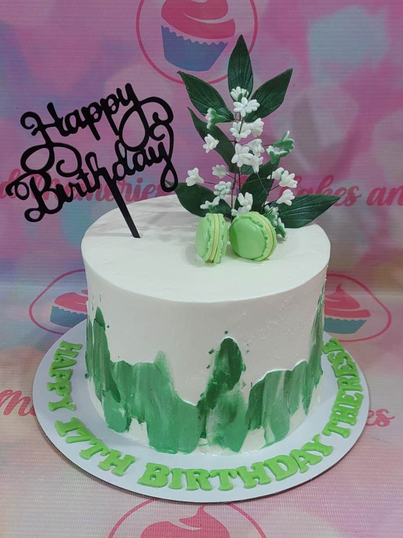 White minimalist cake with green palette knife icing, green macarons, and a white floral topper with a black Happy Birthday sign.