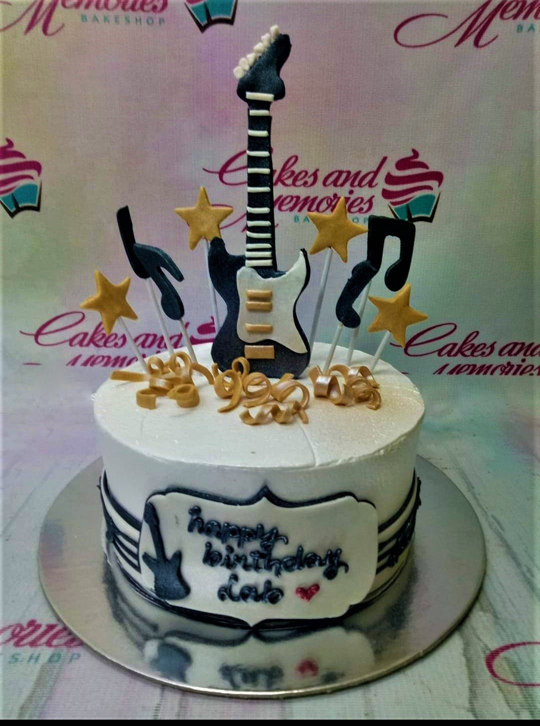 White 1-tier guitar birthday cake with black and gold music notes, stars, and a fondant guitar topper.