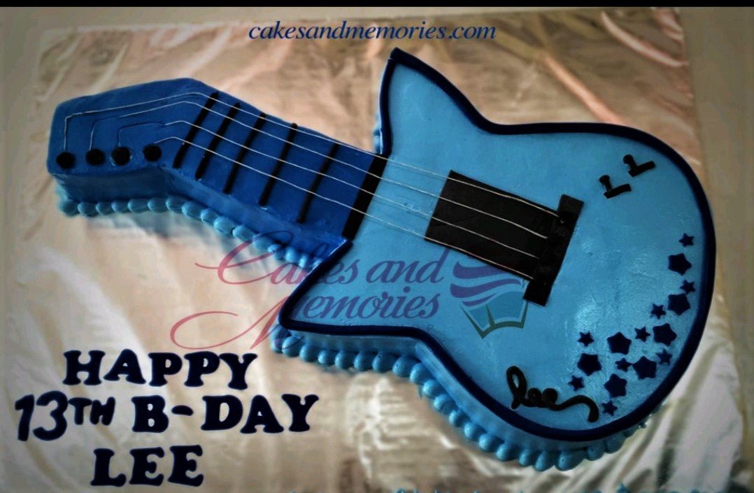 | Decorations | small black stars on guitar body, piped black icing strings and fretboard details, piped blue bead border around the base of the guitar |