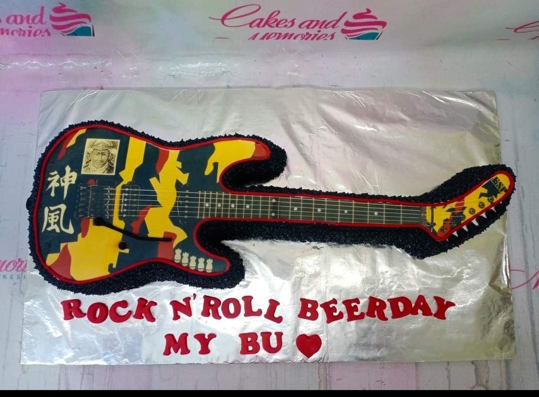 Custom guitar-shaped cake with black textured icing and printed rock and roll graphics on a silver board.