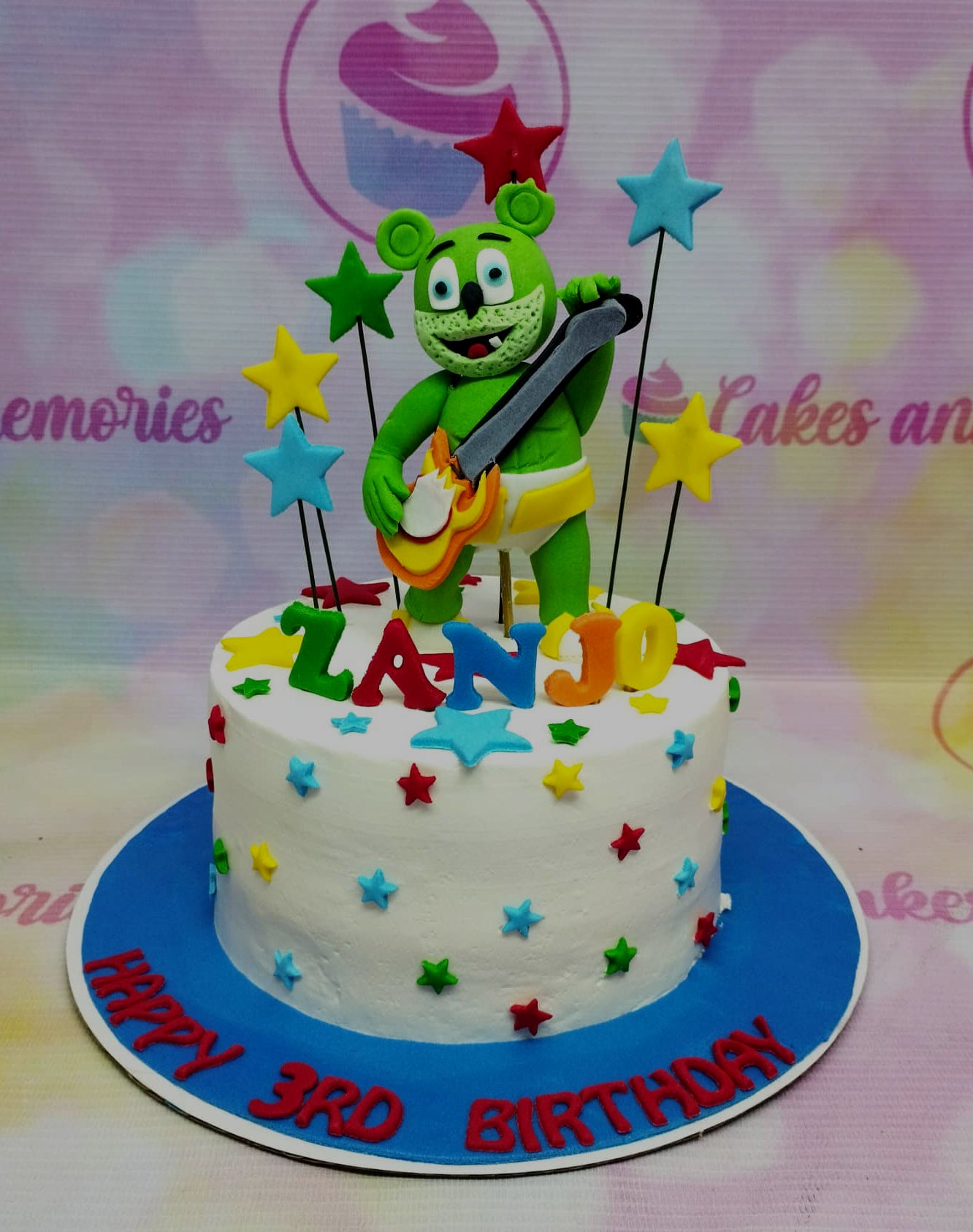 White soft-icing Gummy Bear themed cake with a large green fondant bear playing guitar and colorful fondant stars.