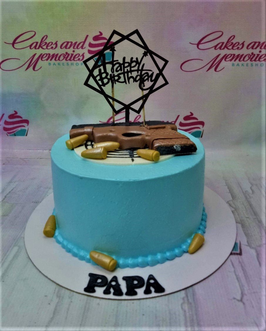 Light blue birthday cake for Papa featuring a 3D fondant handgun and gold bullets with a black geometric Happy Birthday topper.