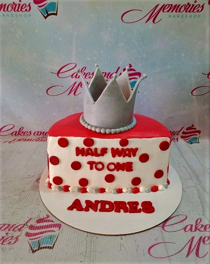 Red and white polka dot half-birthday cake with a silver crown topper and red gumpaste letters.