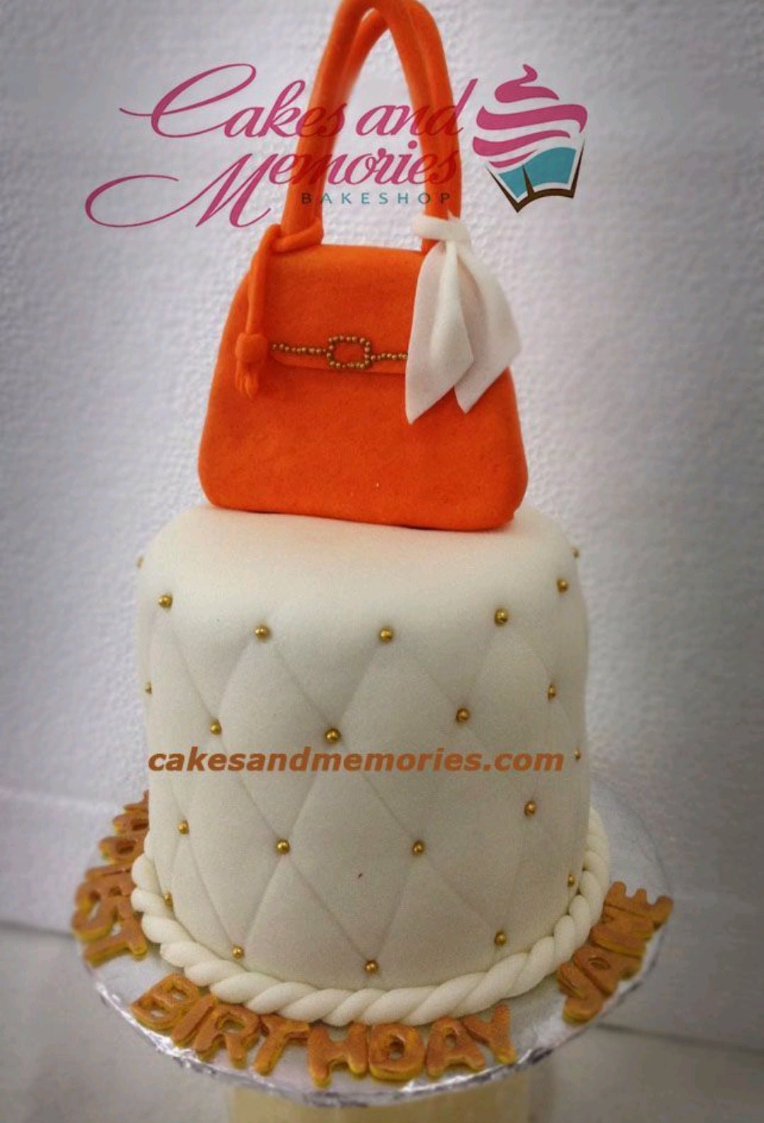 White quilted fondant cake with gold dragees and a large orange gumpaste handbag topper.