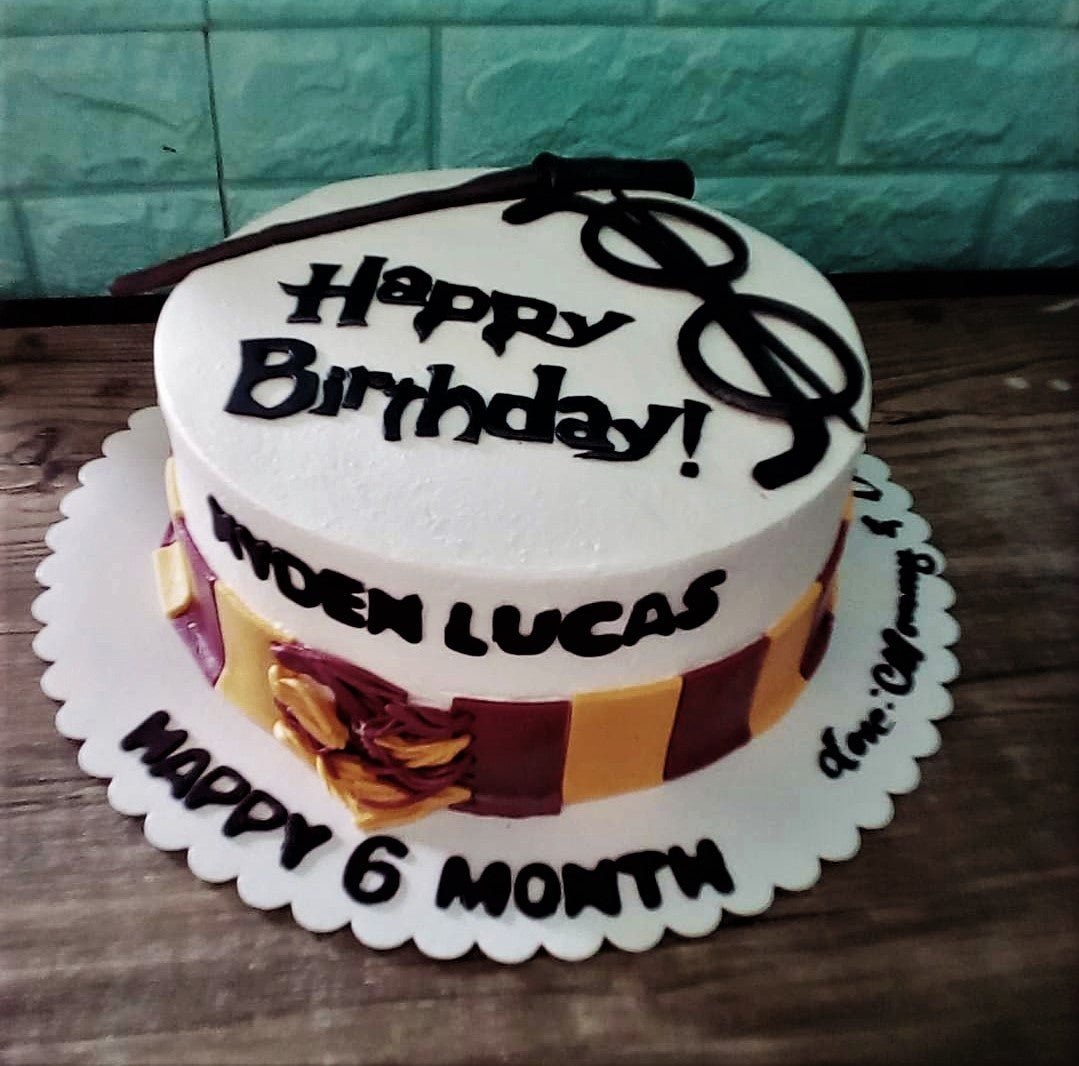 Harry Potter themed birthday cake with white icing, black glasses and wand toppers, and a maroon and gold striped side wrap.
