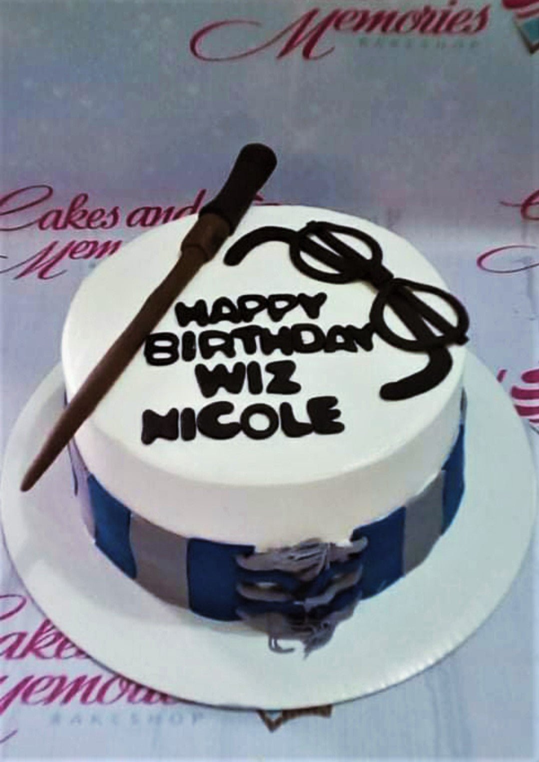 Harry Potter themed white cake with a fondant wand, glasses, and a blue and gray striped scarf border.