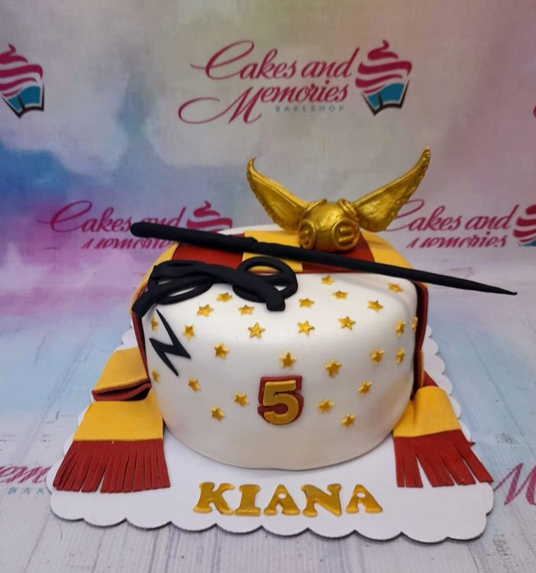 Harry Potter themed fondant cake with a golden snitch, wand, glasses, and Gryffindor scarf accents.