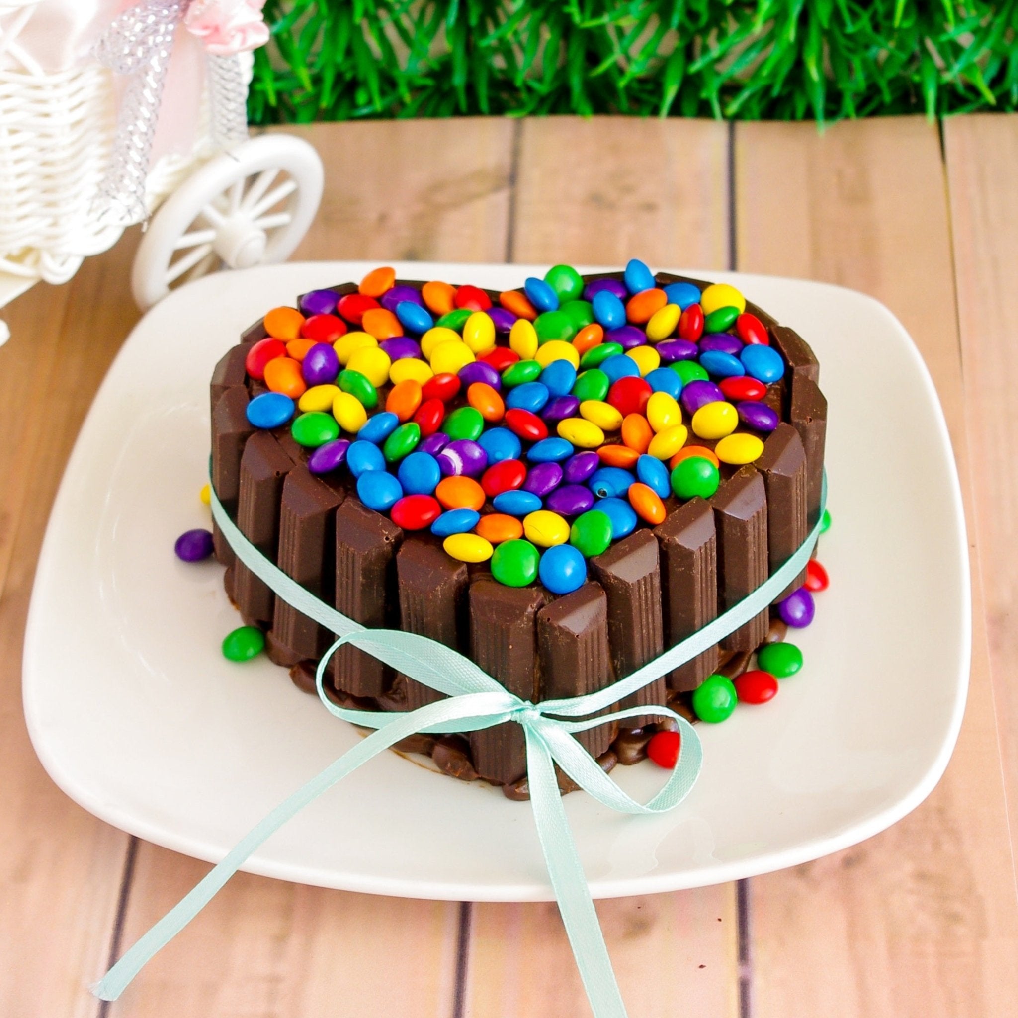 Heart-shaped chocolate cake surrounded by chocolate bars and topped with colorful chocolate candies and a light blue ribbon.