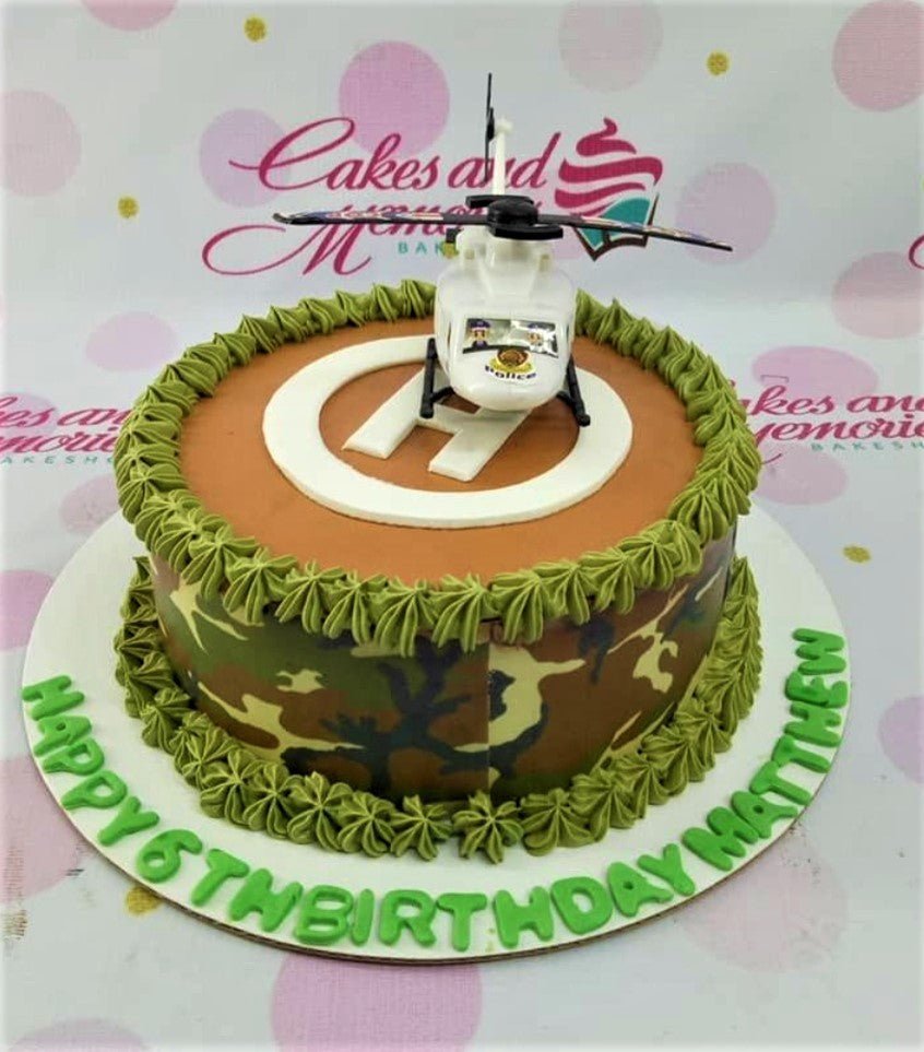 Camouflage themed birthday cake with a white police helicopter toy topper and green icing borders.