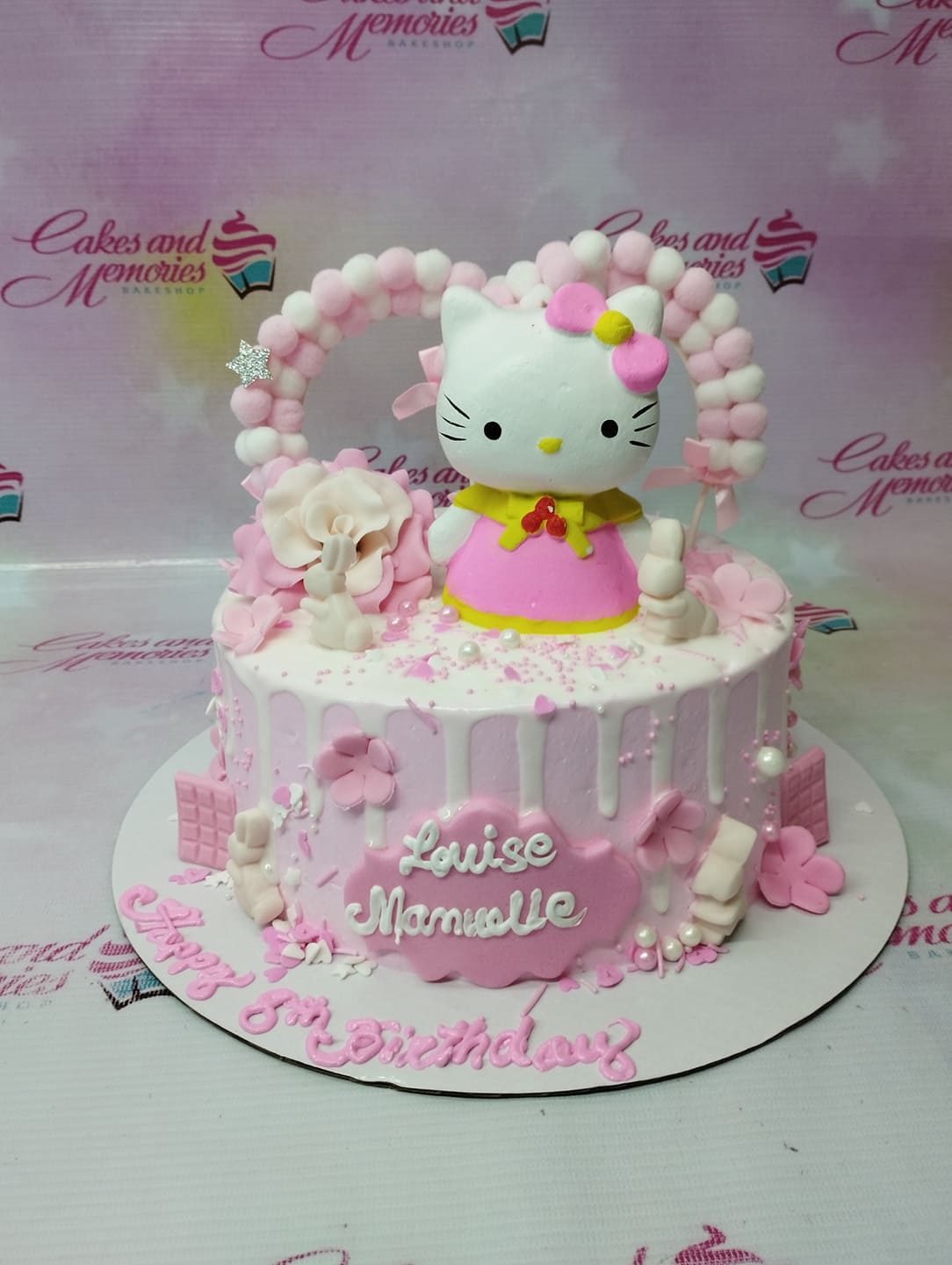 Pink Hello Kitty birthday cake with white chocolate drip, fondant flowers, and a large Hello Kitty 3D figure on top.