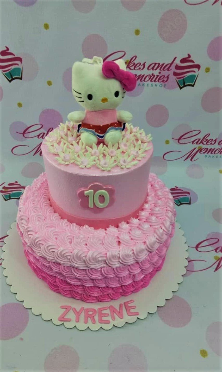 Two-tier pink Hello Kitty birthday cake with ombre icing rosettes, a plush Hello Kitty topper, and floral icing decorations.