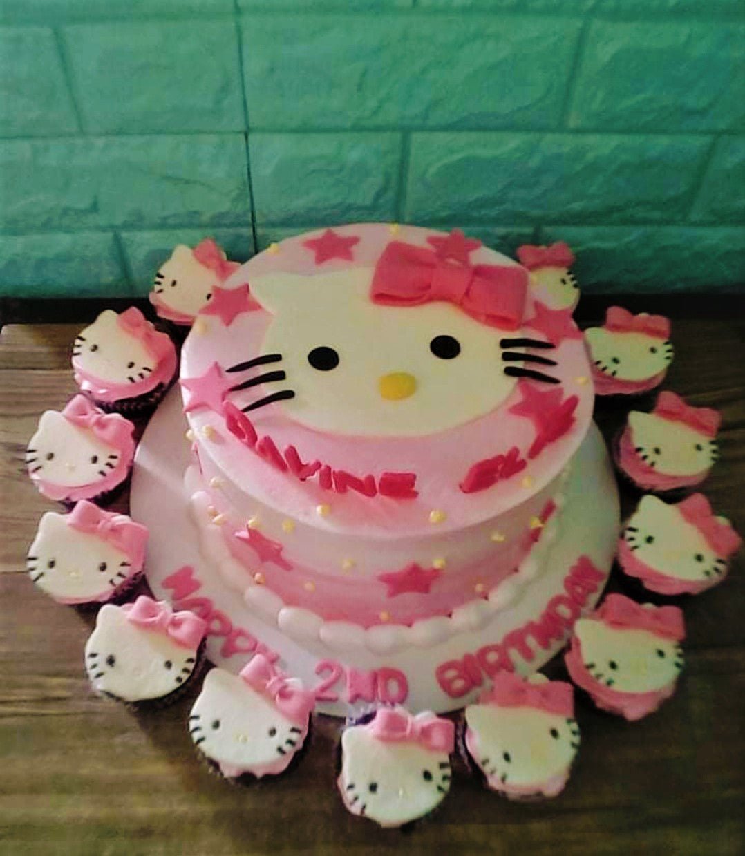 Pink Hello Kitty birthday cake with pink fondant stars and matching Hello Kitty cupcakes arranged around the base.