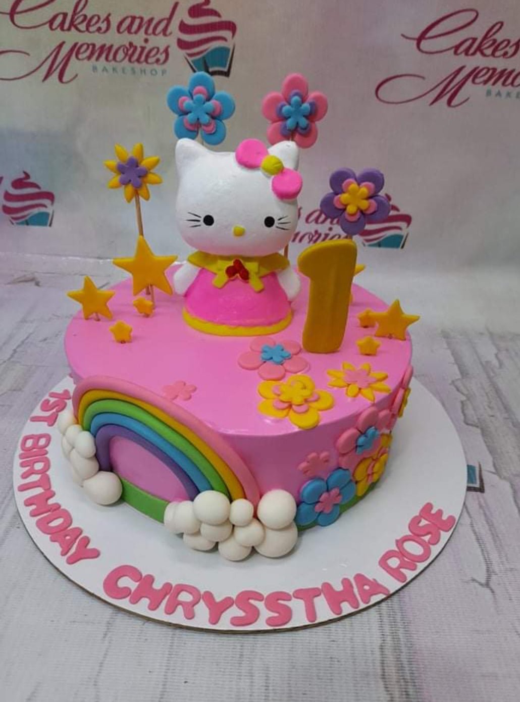 Pink Hello Kitty 1st birthday cake with a fondant rainbow, 3D Hello Kitty figure, and colorful gumpaste flowers.