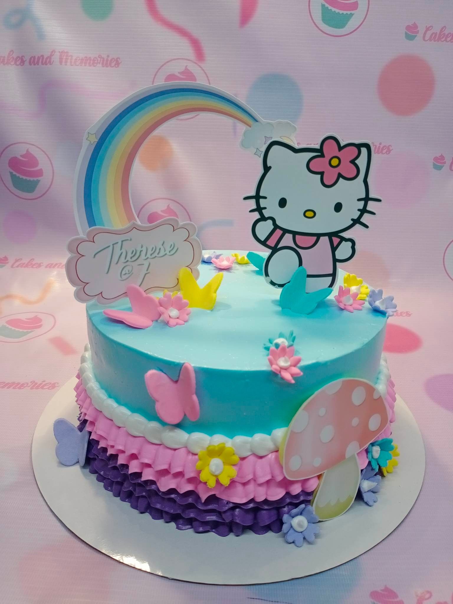 Light blue Hello Kitty birthday cake with a rainbow topper, pink ruffles, and colorful fondant butterflies and flowers.
