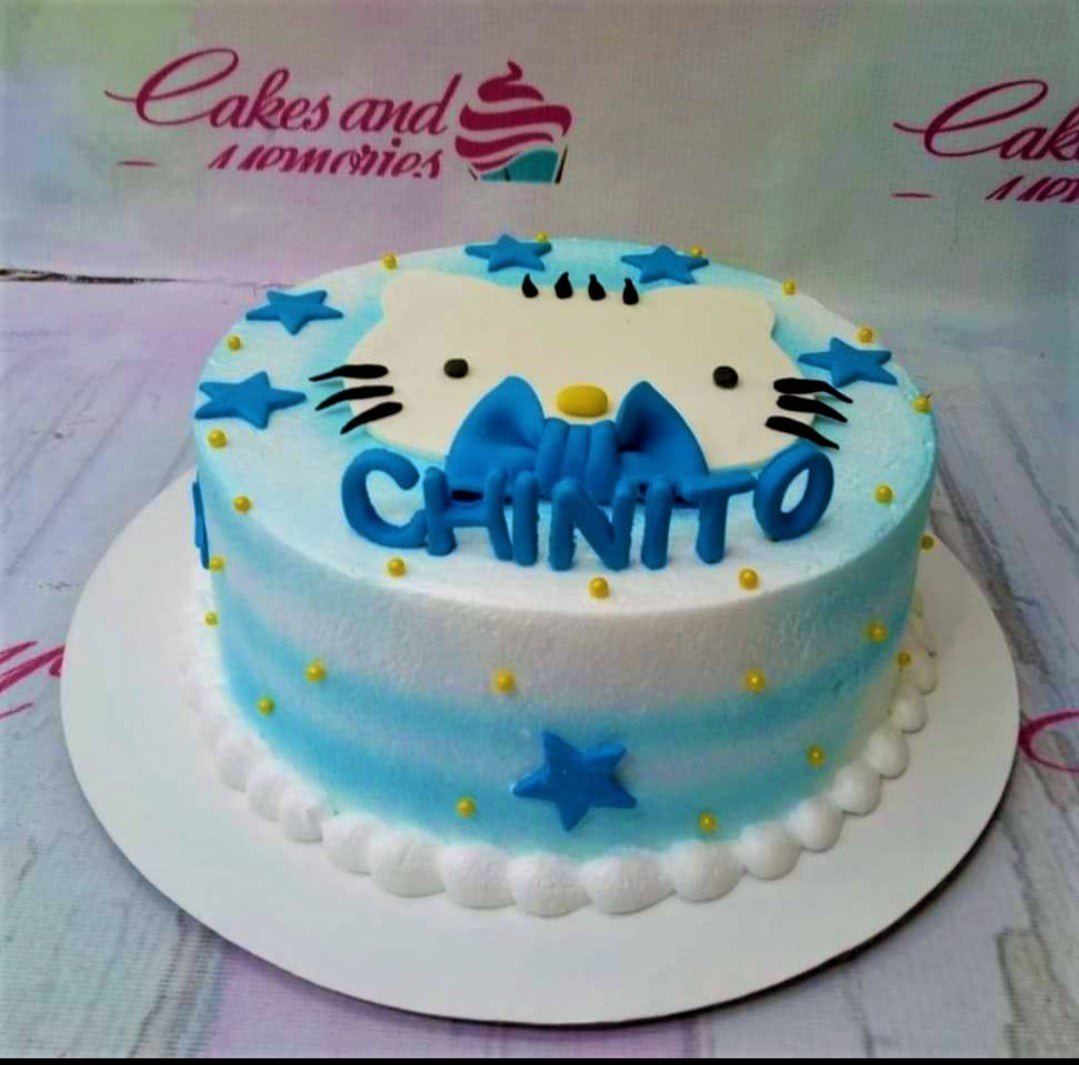 Light blue and white Hello Kitty themed cake with blue fondant bow and yellow edible pearls.