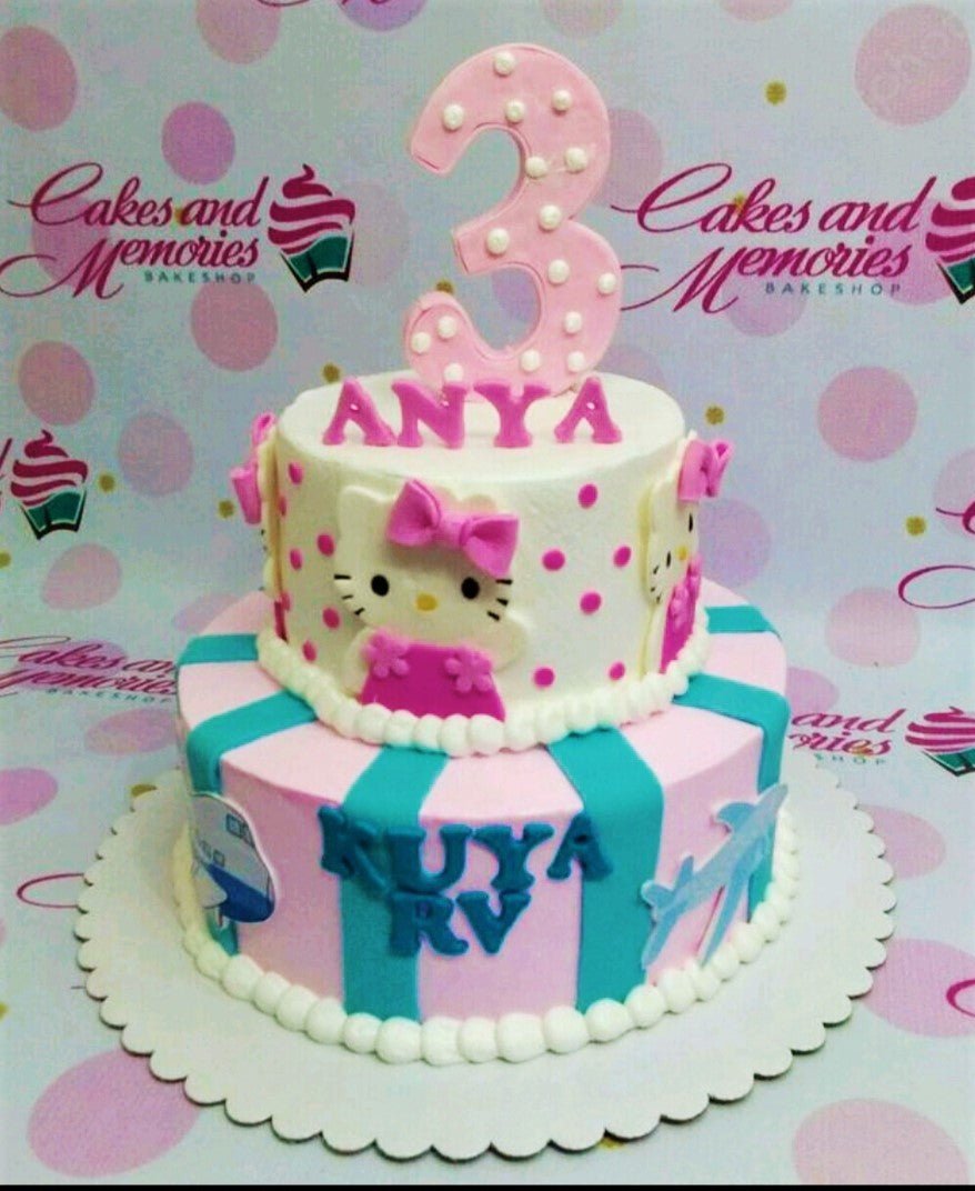 Two-tier Hello Kitty themed cake with pink and teal stripes, pink polka dots, and a large pink number 3 topper.