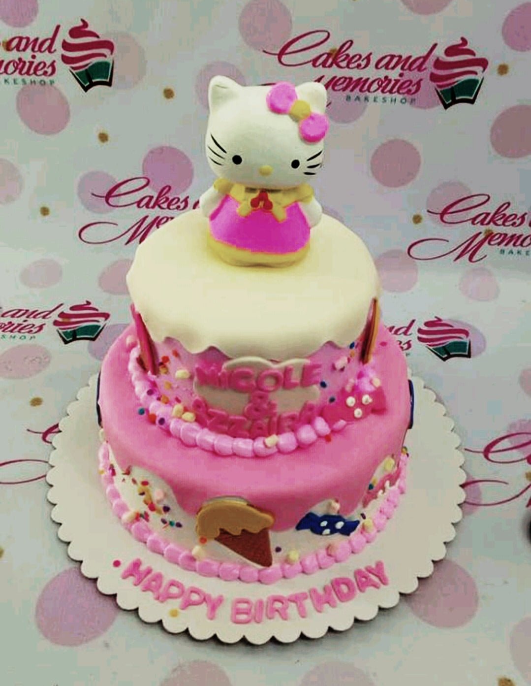 Two-tier pink Hello Kitty themed birthday cake with a 3D fondant figure, ice cream cone decorations, and colorful sprinkles.