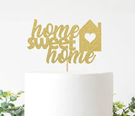 White minimalist cake with a gold glitter Home Sweet Home cardstock topper featuring a house and heart cutout.