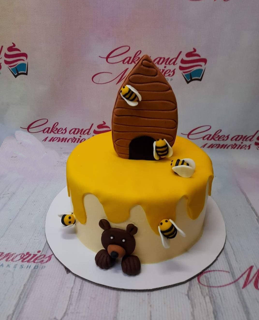 Honey bee and bear themed fondant cake with a large beehive topper and yellow honey drip effect.