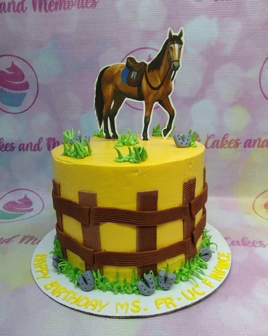 Yellow horse themed birthday cake with a brown horse printout topper, brown fence gumpaste panels, and green icing grass accents.